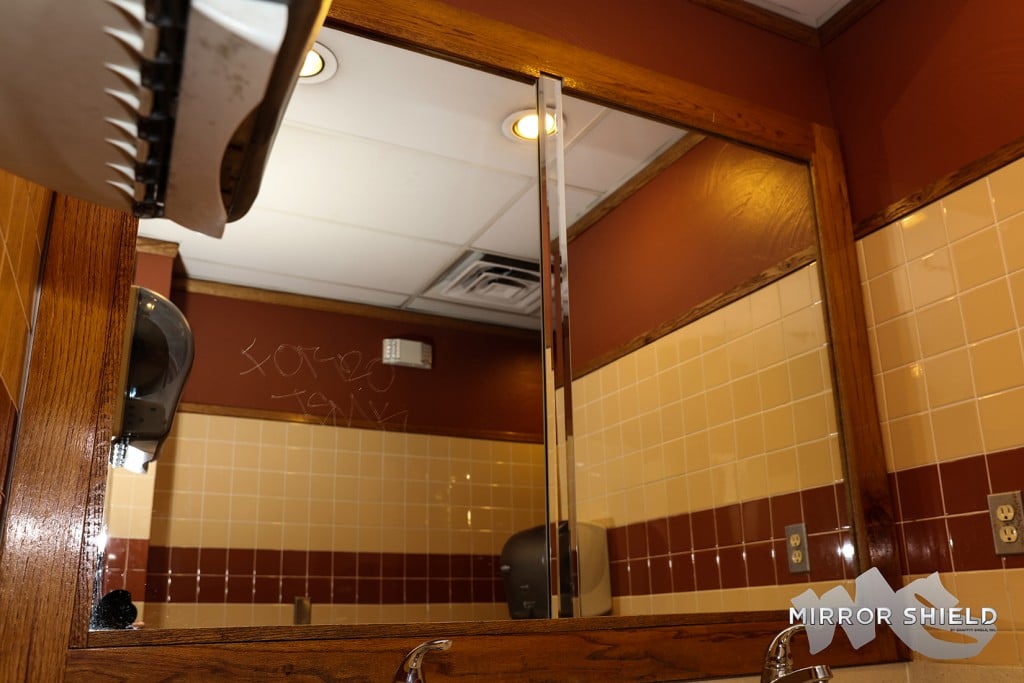 Mirror Shield provides a reflective cover to a mirror and protects it from future damage. If a vandal tries to carve into a mirror with Mirror Shield installed it will only destroy the cover and not the mirror underneath. This is a much greener solution to replacing the entire mirror. Like all other Graffiti Shield products it is acid resistant and uses the same adhesive so that it can’t be pulled off by the general public, but by a trained technician without leaving any residue behind.