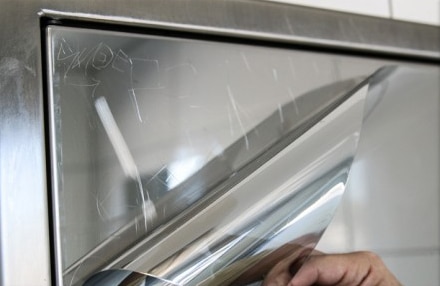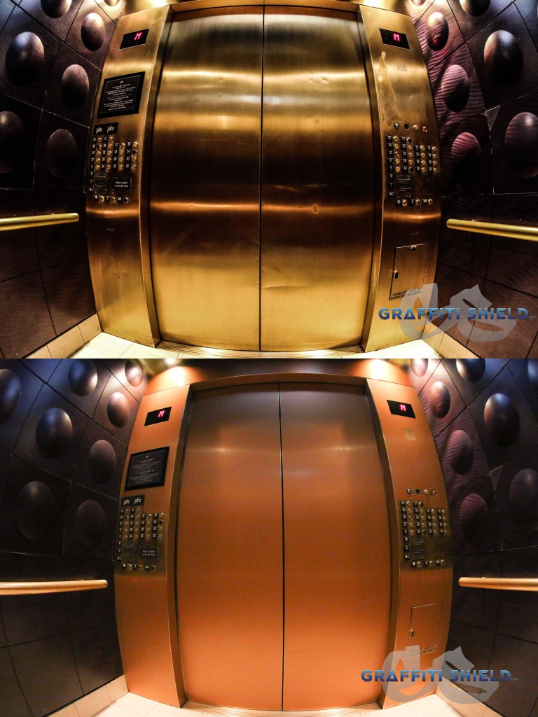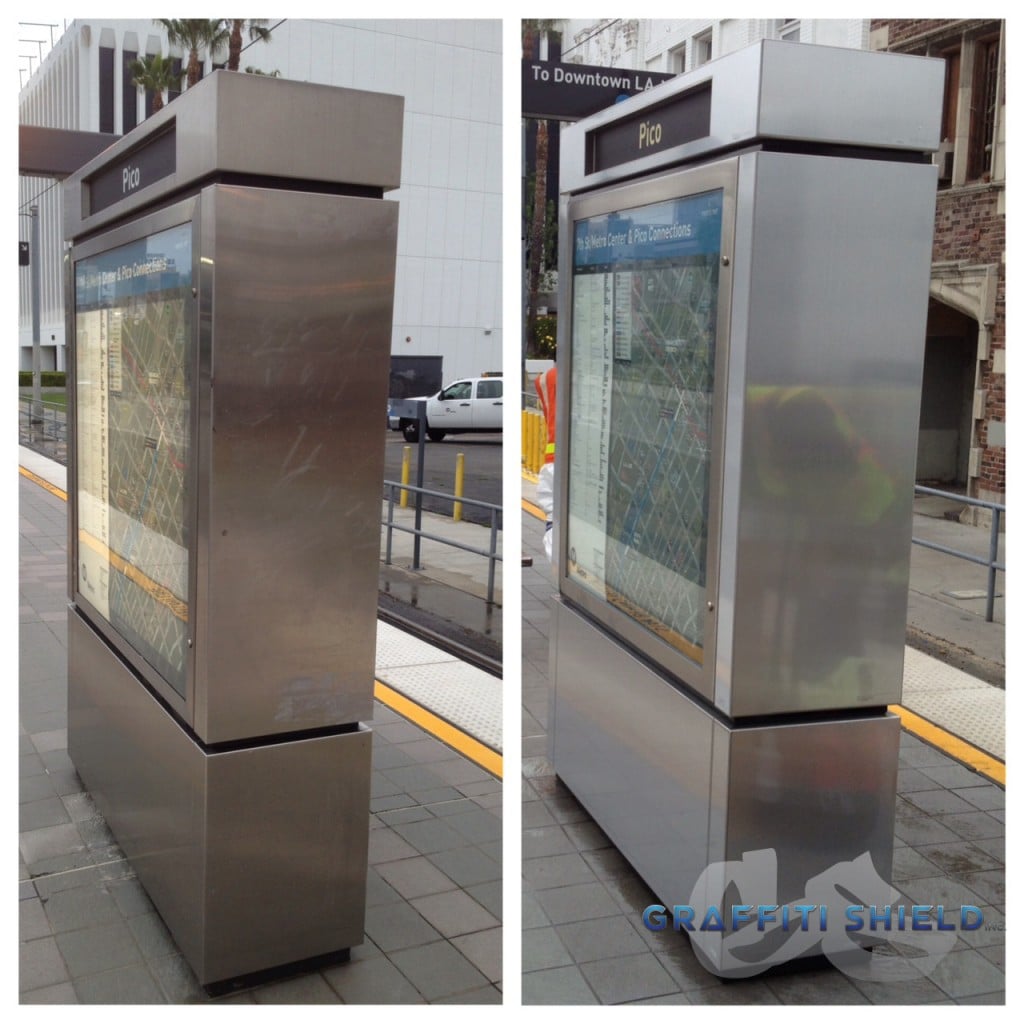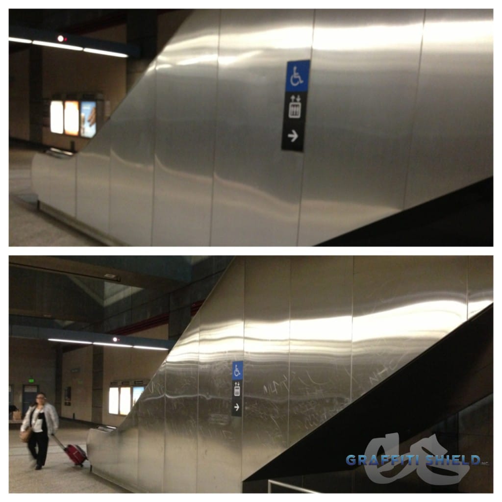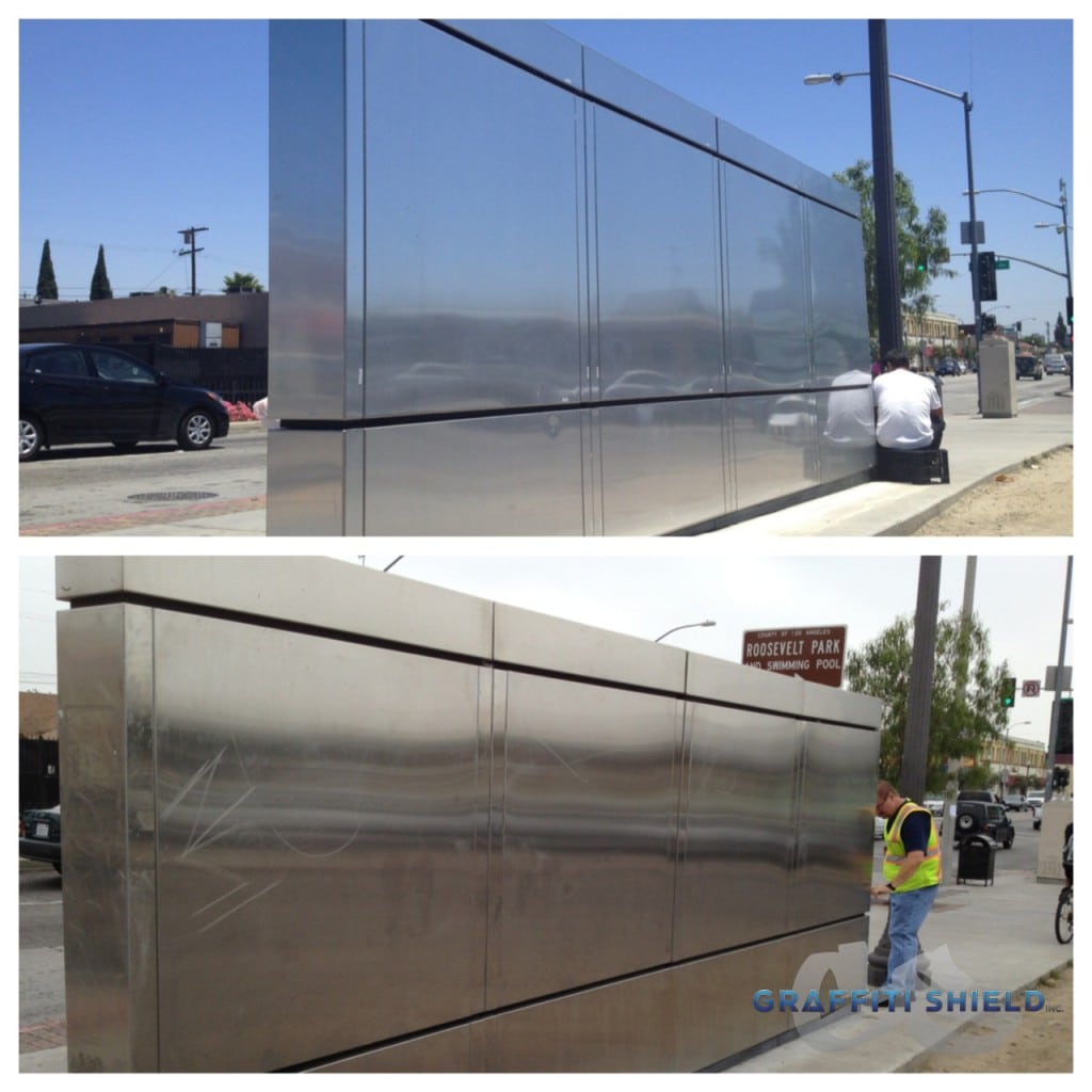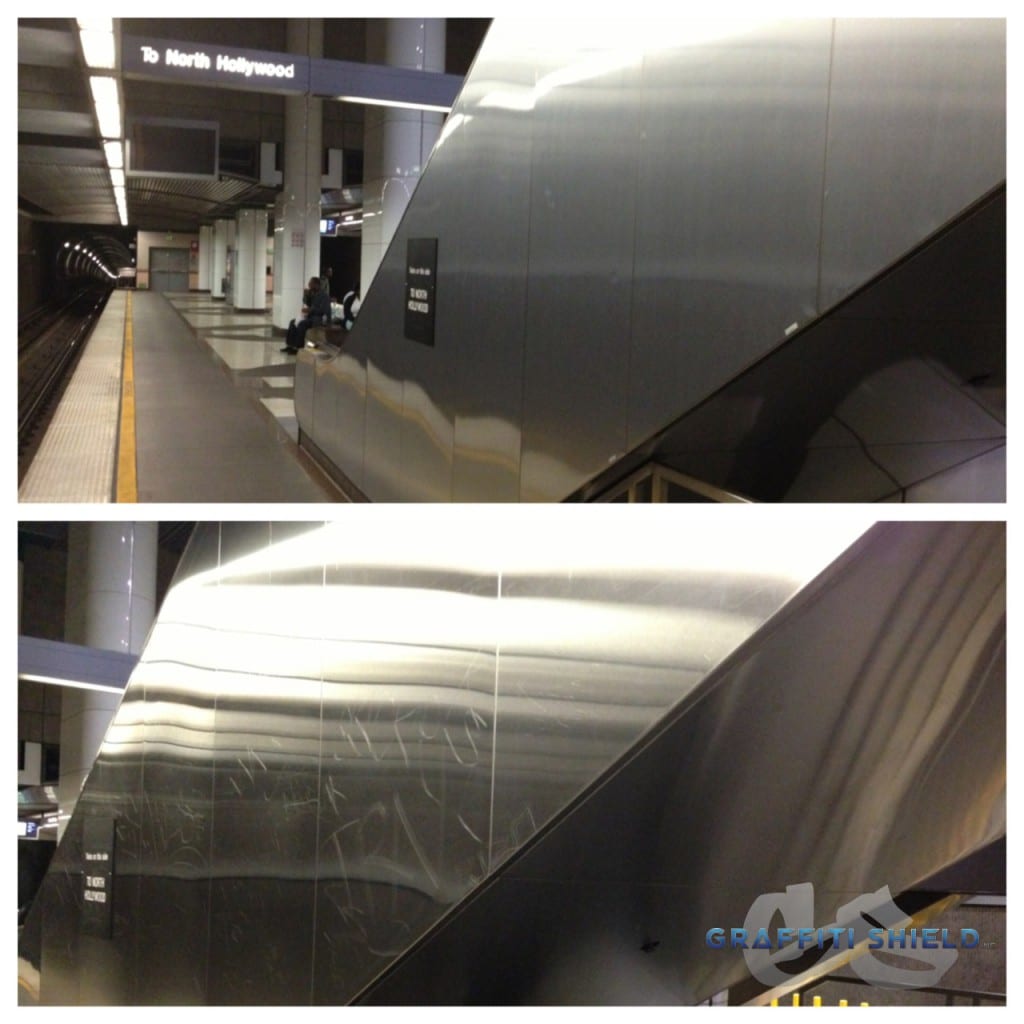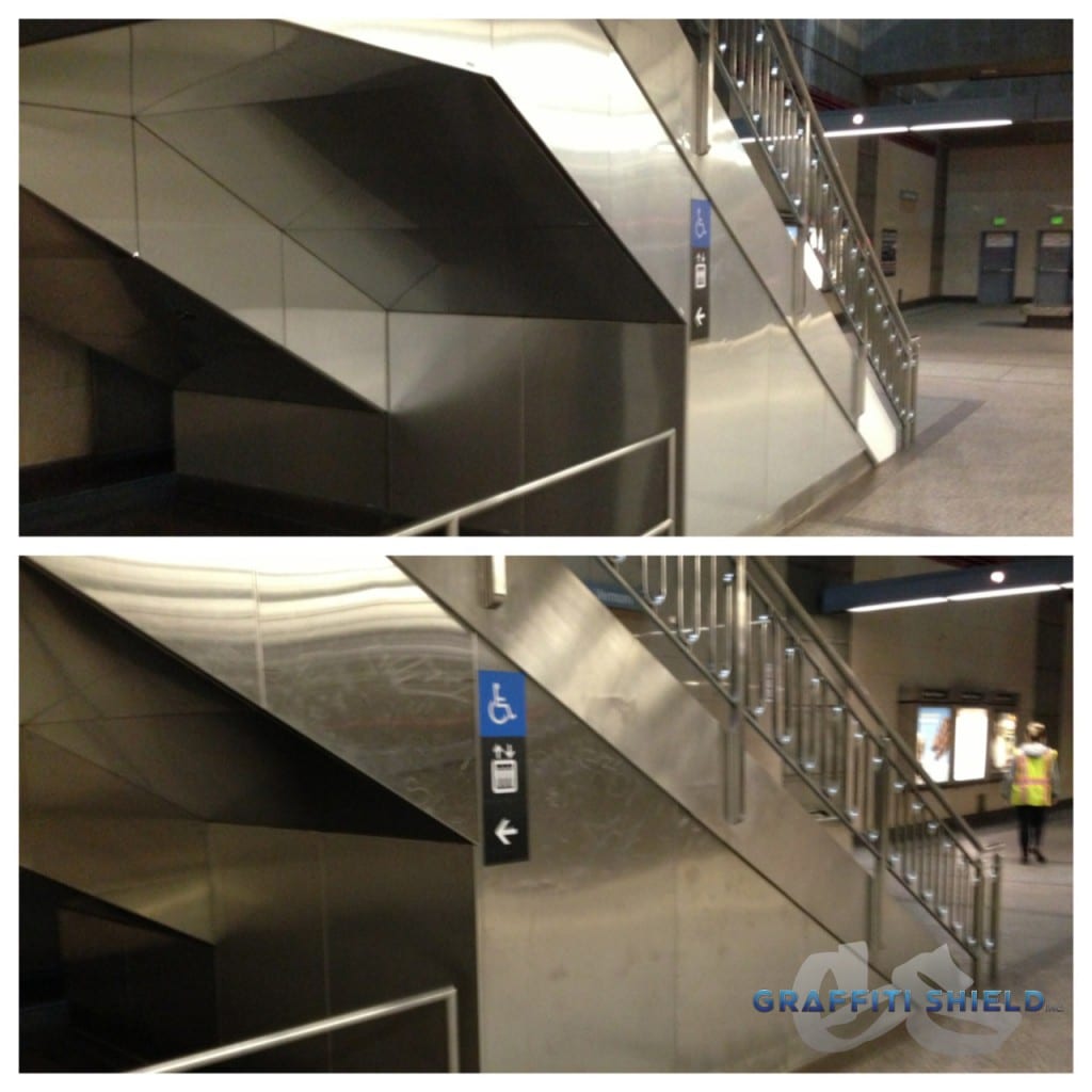 Designed to protect Stainless Steel from vandalism and graffiti, Stainless Steel is a material chosen for its resistance to corrosion and rusting. However, Stainless Steel is vulnerable to anything abrasive. Vandals can scratch their name into stainless steel with things like keys, knives, and screwdrivers with minimal effort and cause great damage to the surface. Since Stainless Steel is pre-finished at a factory with large format machinery to give it a polished grain appearance, repairing damage by hand in the field is virtually impossible to achieve without having a refinished or repaired look.