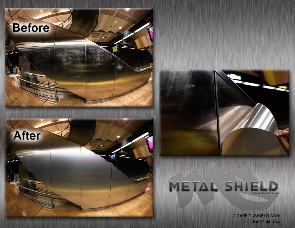 Metal Shield is a 6.5 MIL thick Anti-Graffiti Abatement and Obscuring film to be applied on existing metal surfaces to replicate the original.